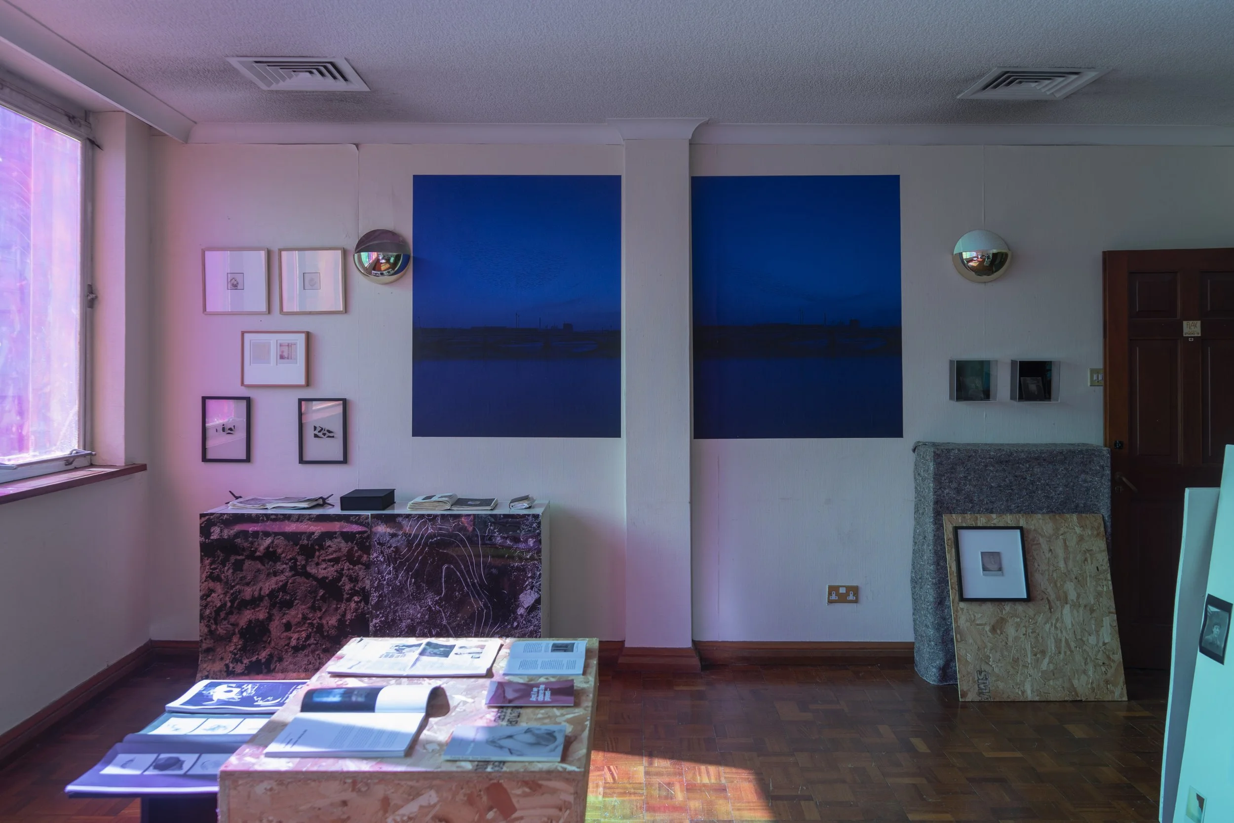 Malcolmson’s Untitled Soundscape #1, 2025 is a responsive audio piece to Tevlin’s moving image work (LO-TEK, 2024), exploring themes of place, land, and human presence through a multilayered soundtrack. Archival field recordings, distant hums, and fragmented voices merge with the tactile textures of celluloid tape. Accompanying both works, located in Studio 18, is Horizon, 2025, a light installation featuring shifting hues of violet, purple and blues, resulting in immersive play with perspective and movement. Malcolmson’s further presentation of an open studio showcases his accumulation of work from his membership at Flax Art Studios 2020-2025, featuring process-based sketchbooks, a curated selection of pervious exhibited works, publications and forthcoming projects.